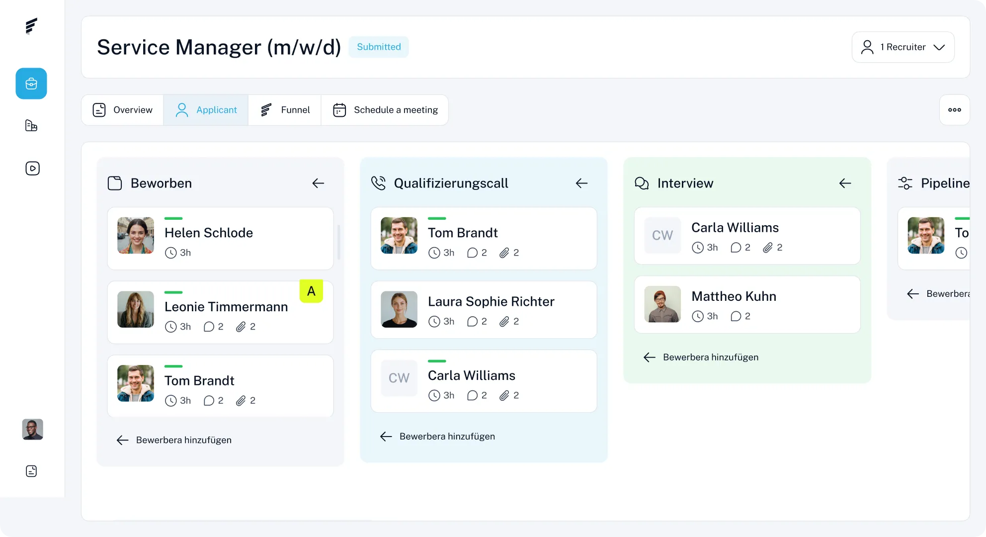 Was als MVP begann, ist heute das Herzstück von Funnellab und hat die Art und Weise, wie Recruiter arbeiten, komplett auf den Kopf gestellt. Unsere Plattform spart ihnen jede Menge Zeit und bringt sie schneller mit den perfekten Kandidaten zusammen. Weil wir Funnellab in- und auswendig kennen, haben wir auch die perfekte Website für sie gebaut, mit einem klaren Design und intuitiver Nutzerführung. So wird die ganze Reise für Recruiter und Bewerber zum Kinderspiel. Am Ende des Tages sind wir überzeugt: Mit den richtigen Tools ist der ideale Kandidat immer nur einen Klick entfernt.